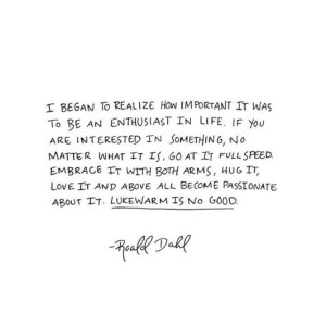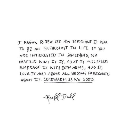 I came across this piece by Roald Dahl. Here he talks about going at full speed, full speed at things your are interested in, enthusiastic about. He talks about embracing it completely and passionately. Being lukewarm is no good!
